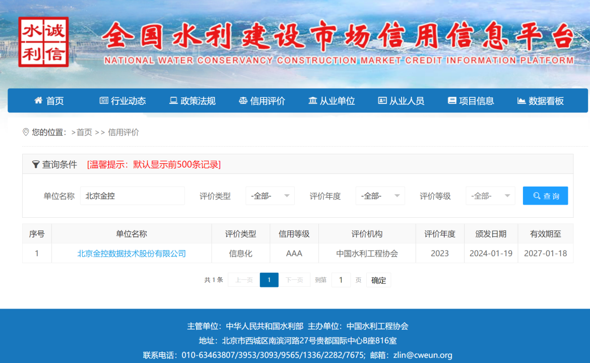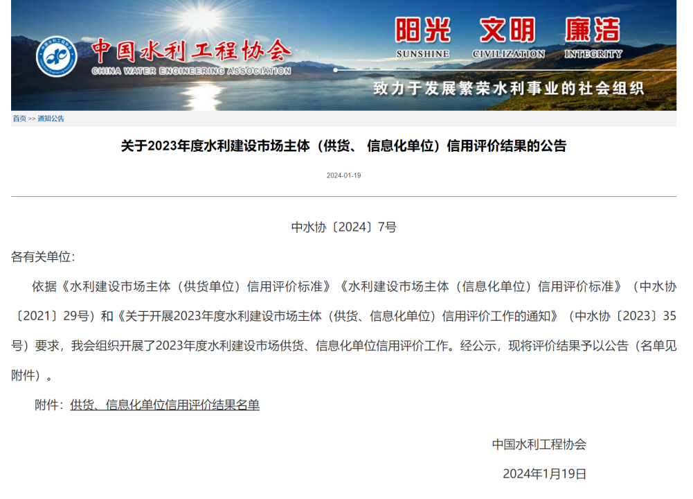 2024年1月19日,中國水利工程協(xié)會發(fā)布了《關(guān)于2023年度水利建設(shè)市場主體(供貨、信息化單位)信用評價結(jié)果的公告》。在此次評價中,金控?cái)?shù)據(jù)以其卓越的綜合實(shí)力和良好的信用記錄,榮獲“全國水利建設(shè)市場主體AAA級信用評價”。