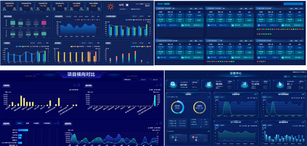 基于海量數(shù)據(jù),挖掘數(shù)據(jù)價值,從不同的角度出發(fā),包括數(shù)據(jù)中心、生產(chǎn)中心、項目橫向?qū)Ρ?、設備中心等,通過多個可視化數(shù)據(jù)展示頁面,全面了解運營相關水電藥泥、設備、運維等各類數(shù)據(jù),利用數(shù)據(jù)為管理者提供決策參考。